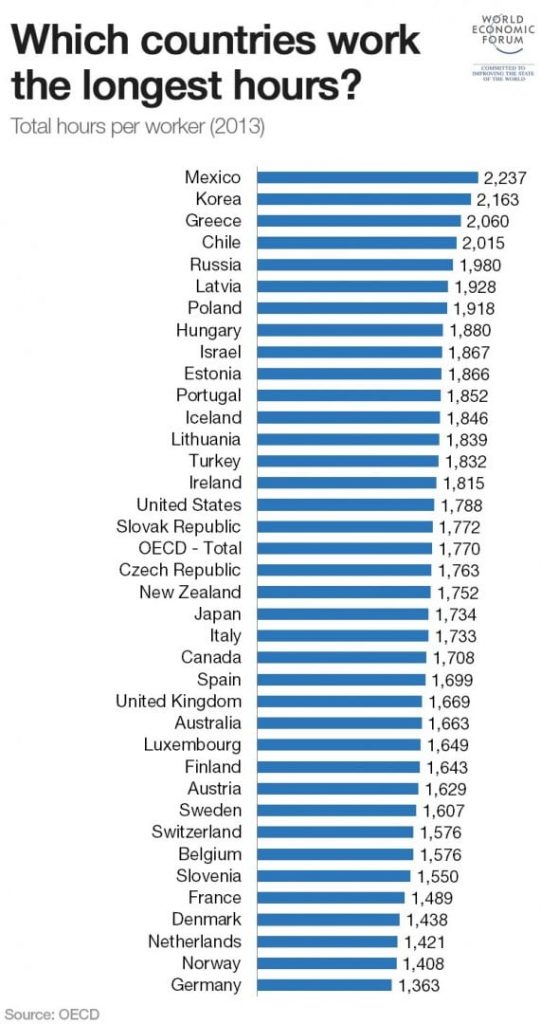 Saksalla on tehokkaan maan maine ja siellä ansaitaan hyvin. Kuitenkin kansainvälisen vuosittaisen työtuntitaulukon mukaan siellä tehdään vähiten työtunteja vuodessa OECD (Organisation for Economic Cooperation and Development) maissa.
