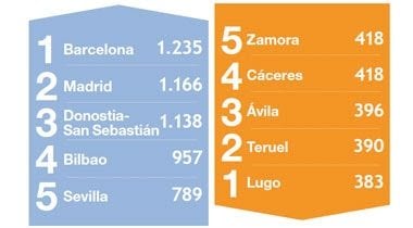 Vuokrien keskihinnat ovat pysyneet kutakuinkin samassa. Eniten ne ovat nousseet Las Palmasissa ja Sevillan alueella. Santa Cruz deTenerifalla ja Galiciassa hinnat ovat laskeneet eniten.
