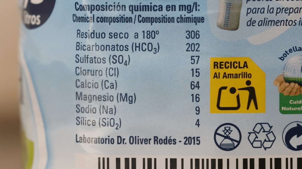 Toiseksi pullovedeksi valittiin “débil” -merkitty tuote (kuva yllä). Tämä tarkoittaa hyvin puhdasta vettä, jota Espanjassa suositellaan lapsille. Tälläinen on mm. Lidlissä myytävä lähdevesi “Chumacero”, jonka sisältöarvot eli lukemat pullon kyljessä ovat pienimpiä mitä markkinoilta löytyy.